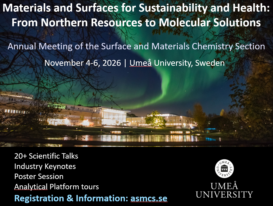 The 2026 Annual Meeting of the Surface and Materials Chemistry Section of the Swedish Chemical Society brings together researchers from academia and industry to explore the latest advances in surface and materials science. Join us in Umeå – gateway to the Swedish Arctic – for three days of inspiring science, lively discussions, and networking in a unique northern setting.